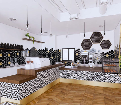 No Better Buzz location would be complete without our signature phrases sprinkled throughout the café! First, you are greeted with white hexagon tiles with “It’s Time to Get Buzzed” made from water jetted metal and powder coated matte black inset on the floor, which sets the tone for a lively and energic café experience. Next, on the left-hand side, an LED neon “Life’s Better Buzzed” sign is overlaid on a beautifully painted floral mural by Grand Prestoz, making it the perfect backdrop for coffee dates with friends.