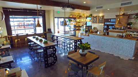 You will notice as you walk in, we of course did not leave out our signature phrases from the design. “Life’s Better Buzzed” is painted on our creatively designed succulent wall, "Coffee First" on the far dining room wall and “It’s Time to Get Buzzed” painted on the floor as you walk in. All painted by the very talented Right Hand Signs in San Diego.